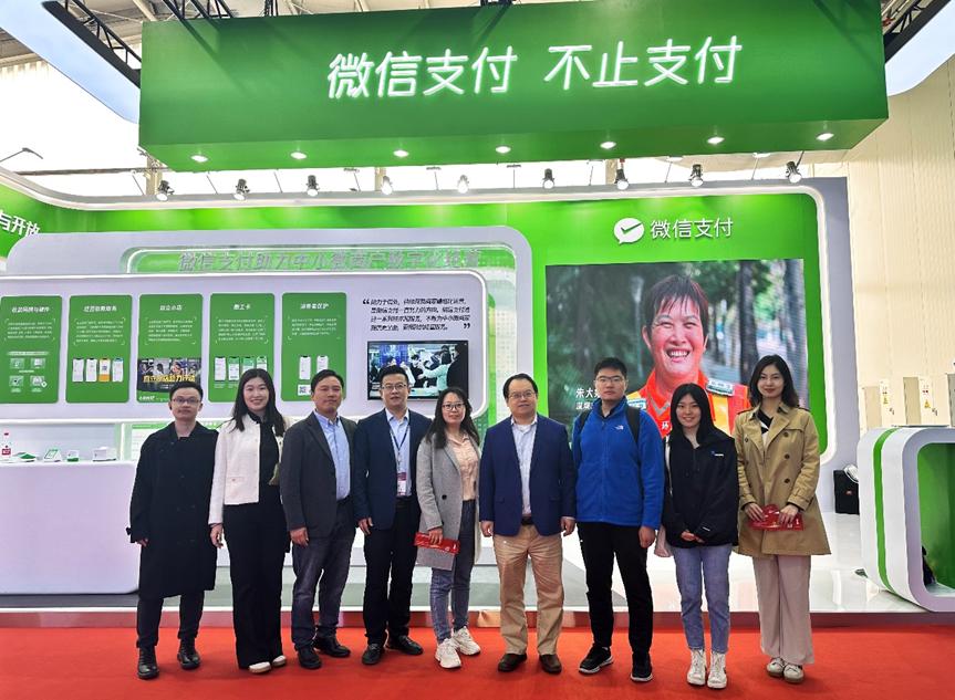 在6号馆,微信支付高级运营经理秦天雄对中心调研团队表示欢迎并合影留念。秦天雄经理、腾讯研究院高级研究员杨望和研究员王诗卉介绍了微信支付的如何服务中小微商家、促进数实融合和承担企业社会责任,以及“刷掌支付”、“经营收款服务”、“数字人民币”、“微信电子小票”和“爱心餐公益计划”等数字化的最前沿落地场景。