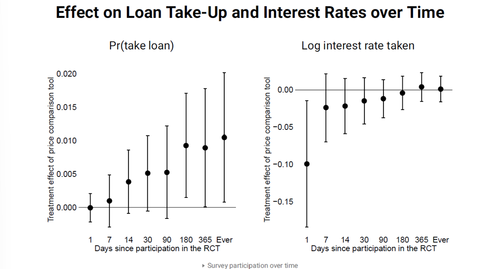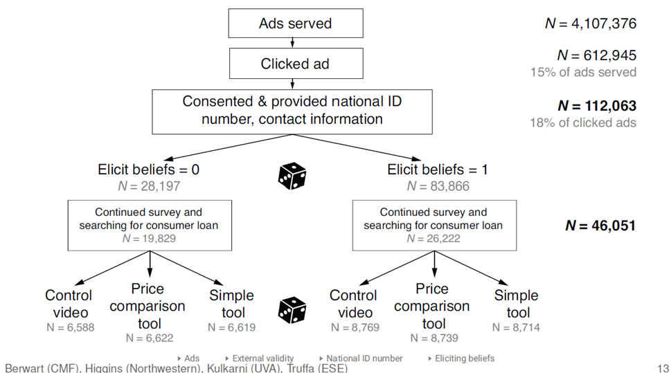 Higgins教授及合作者与智利金融监管机构合作,面向超过11万名寻求贷款的治理消费者开展了一项随机对照试验。首先,通过基线调查收集部分消费者对利率分布的初始信念。随后,将参与者随机分配为三组,分别提供完整的价格比较工具、简易的价格比较工具,或观看一段视频作为控制组。该工具基于智利金融监管机构提供的过去六个月行政数据,展示与用户相似借款人获得的利率条件分布。最后,通过行政数据和后续电话调查,研究者得以追踪参与者的搜索历史、谈判行为及最终贷款条款。