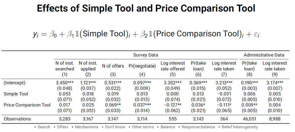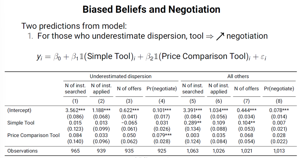 研究进一步检验了理论模型中的预测。首先,对于低估了贷款利率方差的消费者,提供价格比较工具显著提高了他们与银行进行谈判的概率;其次,对于低估了贷款利率均值但低估程度不太大的消费者,价格比较工具将其信念偏差修正至合理范围,并提高了成功谈判的概率。