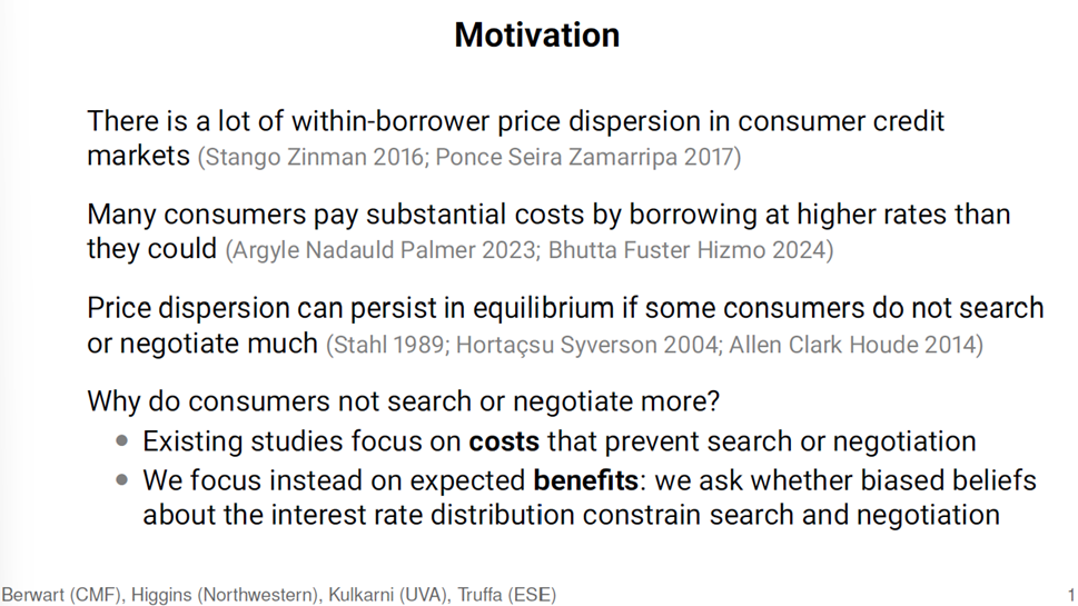 消费信贷市场中存在显著的价格差异,即便是信用状况相似的借款人,获得的贷款利率也可能非常不同。许多消费者因未充分搜索或谈判,而承担了较高的借贷成本。
