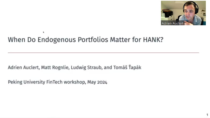 2024年5月21日,北京大学国家发展研究院、北大数字金融研究中心举办了春季学期的第九次数字金融Workshop。斯坦福大学经济系助理教授Adrien Auclert带来了有关家庭资产组合、宏观HANK模型、货币政策、财政赤字的线上论文展示,题目为“When do Endogenous Portfolios Matter for HANK? (内生投资组合在哪些情况下对HANK模型具有重要影响)”。本次Workshop由北大国发院助理教授、中心研究员胡佳胤主持,二十余位师生在线上参与会议并与主讲嘉宾进行了深入的交流和讨论。