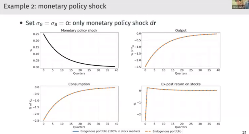 在第二部分,Auclert教授深入探讨了“HANK模型中的外生性与内生性投资组合”的问题。Auclert教授及其团队简化了模型机制,以探讨有效的解决方案。在HANK模型中引入内生投资组合的研究结果,具有广泛适用性,为文献中其他模型提供有价值的参考。具体而言,货币政策的整体影响与基于代表性家户模型的预期效果相类似,同时,赤字融资的财政政策对经济活动展现出显著影响力。