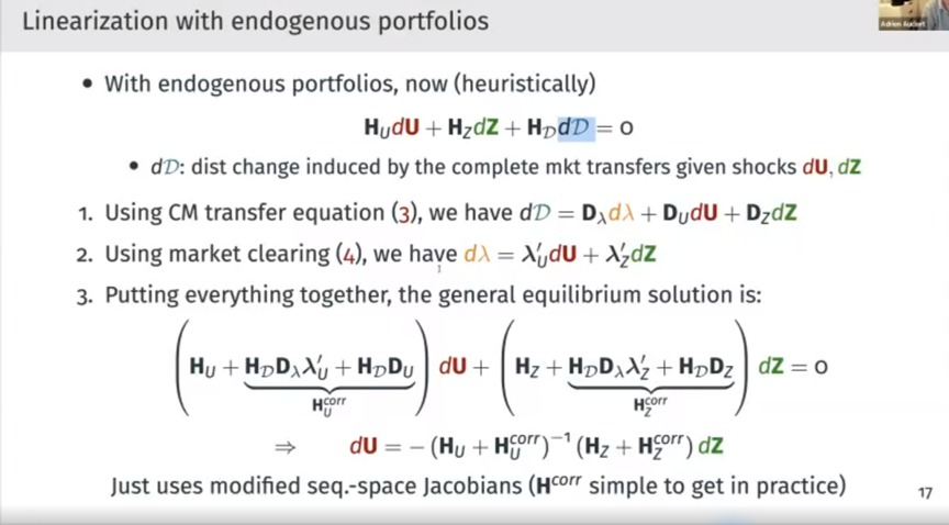Auclert教授及其研究团队采用了序列空间方法深入探究了内生性投资组合问题。在他们的研究中,设定了一个前提:经济冲击仅在时间节点t=0时发生,而异质性家庭则需要在前一时期(即t=-1时)就进行投资组合的选择。通过对最优条件的二阶扰动分析,他们发现,在资产足够丰富的情况下,市场能够有效对冲总体风险,显示出市场的完备性。
