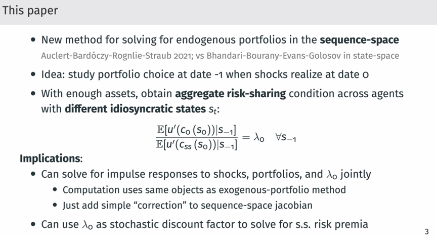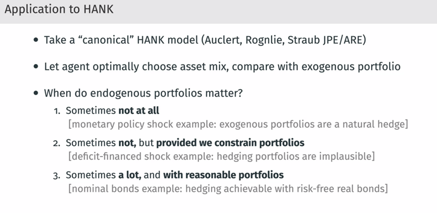 然而,在Auclert教授及其合作者的最新研究中,他们突破了这一传统框架,量化了内生投资组合在HANK模型中的作用。他们提出了一个关键问题:若允许代理人根据模型内部的经济条件和风险状况来优化其投资组合,从而对冲总体风险,那么先前基于HANK模型得出的结论将如何变化?这一研究路径旨在更贴近现实经济环境,其中代理人的投资决策通常是基于对当前和未来经济状况的理性分析,而非简单地接受外生给定的投资组合。