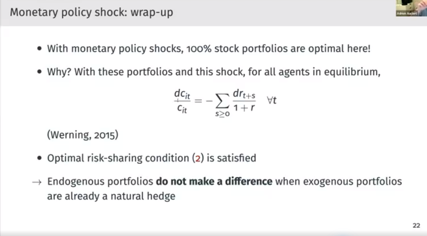 随后,Auclert教授分三部分进行了详尽的讲解。在第一部分中,他聚焦于“异质性代理人投资组合与风险溢价”的探讨。这一部分主要论述了在包含异质性代理人的环境中,一般静态投资组合的构建问题。通过对边际效用、预期收益、资产组合配置以及风险溢价之间的内在关系进行深入分析,Auclert教授推导出了基于二阶扰动的约束条件。这些成果不仅与静态不完全市场一般均衡理论中的研究相呼应,还与动态一般均衡(DSGE)模型中的二阶扰动理论紧密关联。本文献的核心贡献在于揭示了由任意数量代理人的最优行为所引发的约束条件,并将这一静态分析框架应用于异构代理模型,特别是在t=-1时的情境中,即假设所有冲击仅在t=0时发生,此模型为理解零阶投资组合提供了准确的经济学视角。