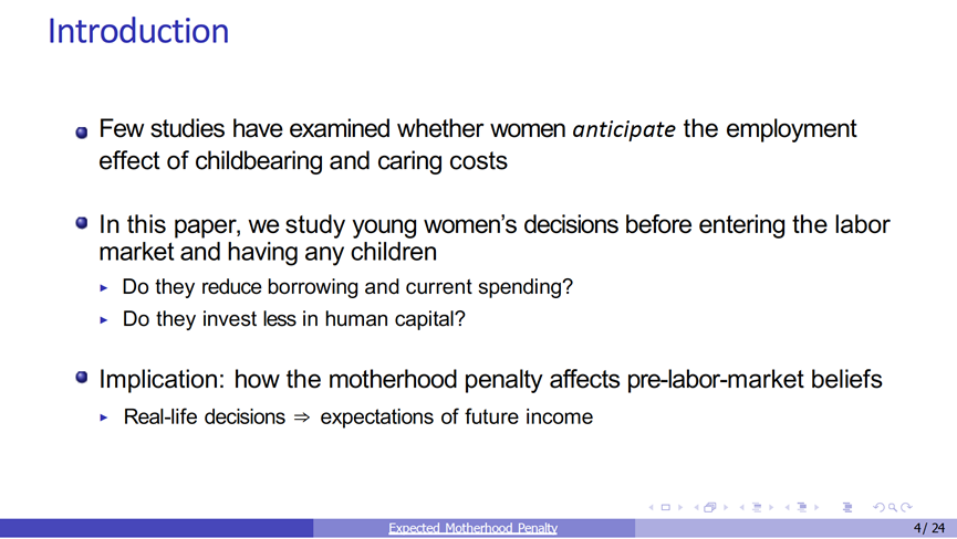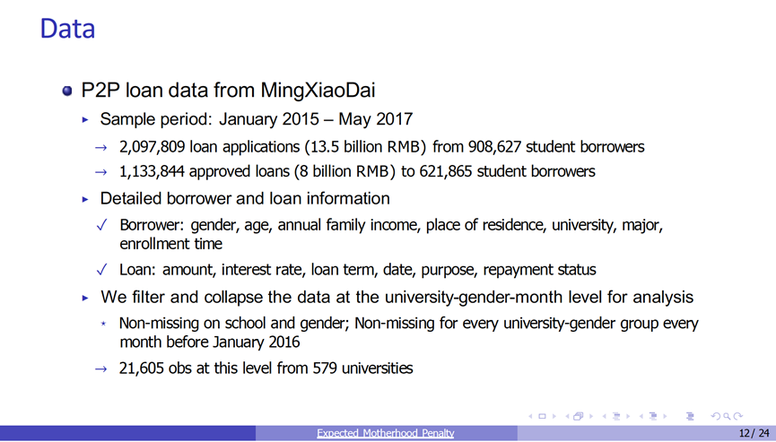 钱文澜教授与其合作者在文章中使用一项对即将成为母亲的女性的就业前景具有负向冲击的政策(中国2016年全面开放二胎政策)分析女性劳动者在进入劳动市场和生育之前的信贷需求,刻画“生育惩罚”(或“母职惩罚,motherhood penalty)对尚未进入劳动市场的女性劳动者决策的影响。