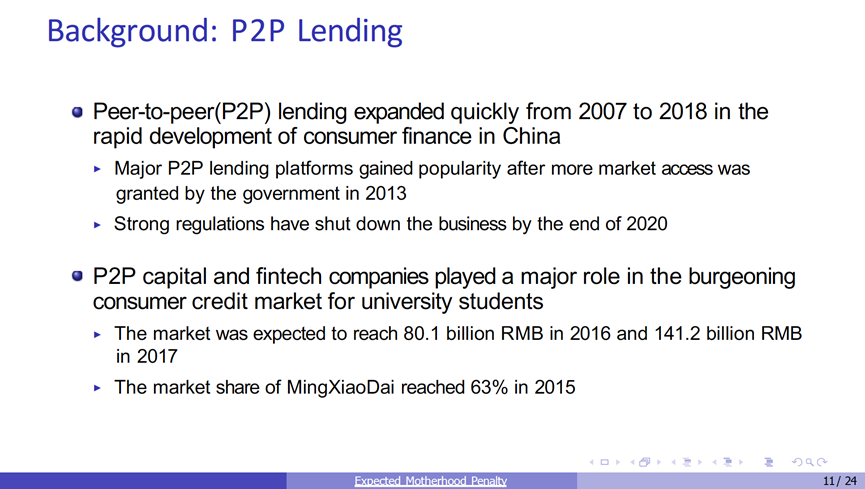 钱文澜教授与其合作者通过某P2P平台校园贷(MingXiaoDai)数据从信贷行为角度切入,并使用DID模型进行估计分析上述问题,发现在2015年7月第一次出现对全面放开二胎政策的公共讨论时,女大学生的贷款申请减少了15.6%(与男大学生贷款申请相比),并且该效应在2016年1月政策实施之后一直显著。