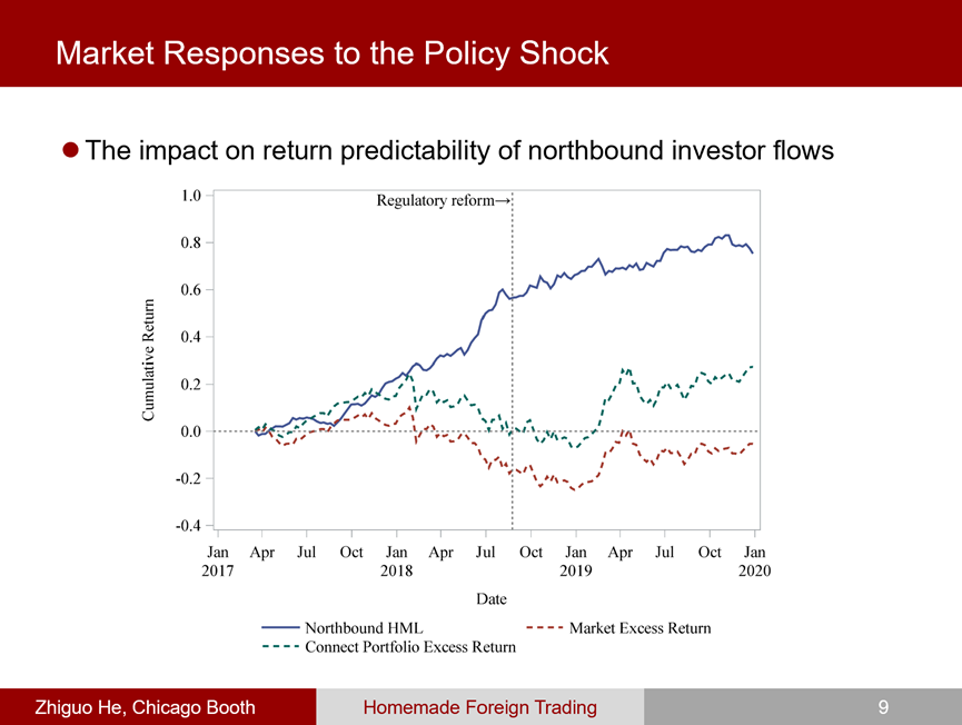何治国教授与合作者发现,在“北向投资者识别码”制度实施以前,从香港买入沪深两市的“北向资金”确实取得了不俗的超额收益。换言之,如果做多“北向资金”买入的股票并做空“北向资金”卖出的股票,投资者可以取得远高于市场平均的收益率。这说明“北向资金”的流向确实具有明显的信息含量。然而,在“北向投资者识别码”制度实施之后,跟随“北向资金”投资的超额收益明显降低。