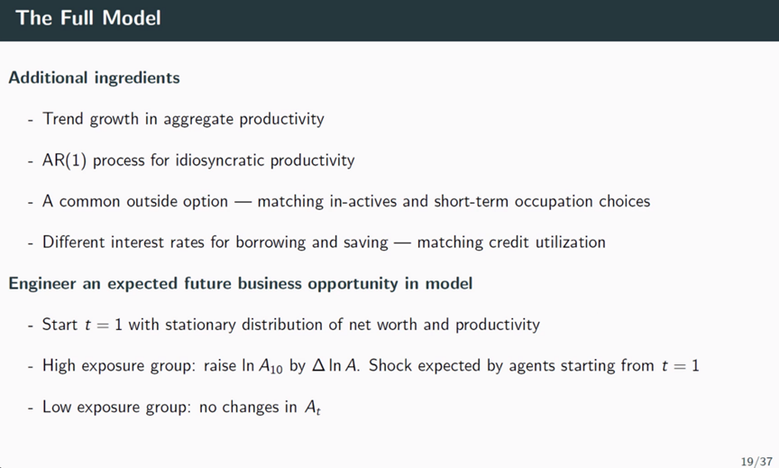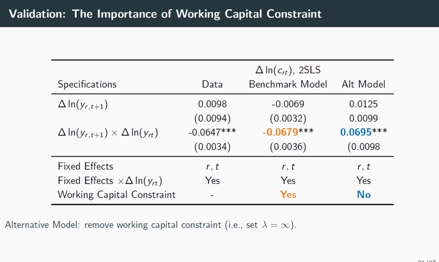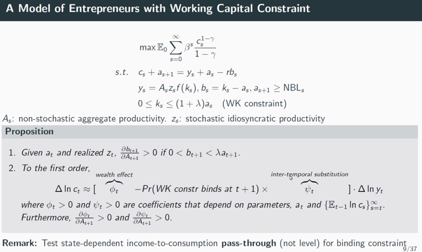 实证研究的结果显示,在预期未来商机的情况下,个体经营者倾向于筹集更多的外部信贷,并表现出当前收入与消费之间较低的关联性。这一模式与传统的消费储蓄行为存在显著差异,但可以通过构建面临营运资本约束的企业家模型来得到合理的解释。通过构建针对面临营运资本约束的企业家模型,深入探讨外部融资与自我融资的变动如何随总生产率的变动而相应调整。