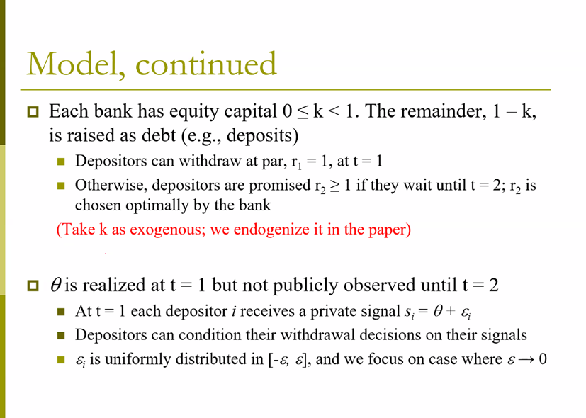 Global game是一种不完全信息博弈,其最重要的实际应用之一就是对金融市场危机的研究,例如银行挤兑、货币危机和泡沫。在这篇文章中,Robert Marquez教授及其合作者建立的具体模型如下。模型包含三期,在第0期,银行决定自己的资本金比例为k,并通过吸纳储户存款的形式筹得1-k,将其投资于长期资产,投资回报为Rθ,其中θ为经济基本面状况,服从于U[0,1],在第1期实现。在第1期,受到外生流动性冲击,一部分储户提前取款,获得r=1,另一部分储户在第1期收到关于θ的一个扰动信号,并以此信息结合自己的期望效用函数决定是否要提前取款,如果银行在第1期将自己资产变现,可以得到。到第2期时,θ的实现值被大家所知,各经济主体效用实现。