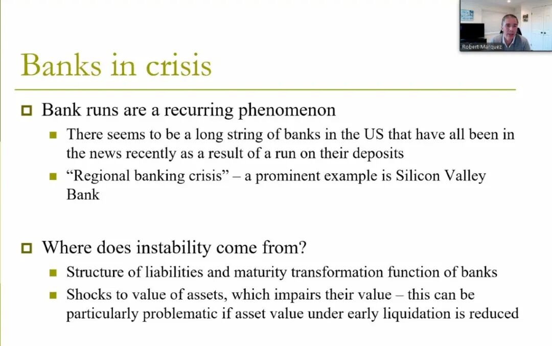 2023年上半年,美国硅谷银行、签名银行、第一共和银行等多家银行因资不抵债而破产。这一系列的银行倒闭凸显了研究储户提款行为以及银行资产价值和风险管理选择的重要性。在这篇文章中,Robert Marquez教授及其合作者使用了标准的银行挤兑模型,研究了当面对流动性冲击时,银行在风险管理和储户挤兑概率之间的权衡。这篇论文将经典的银行挤兑模型与以硅谷银行为代表的中小银行倒闭事件相结合,探究了银行自身风险管理的动力与银行脆弱性之间的关联,对学术和政策都有重要的启示意义。
