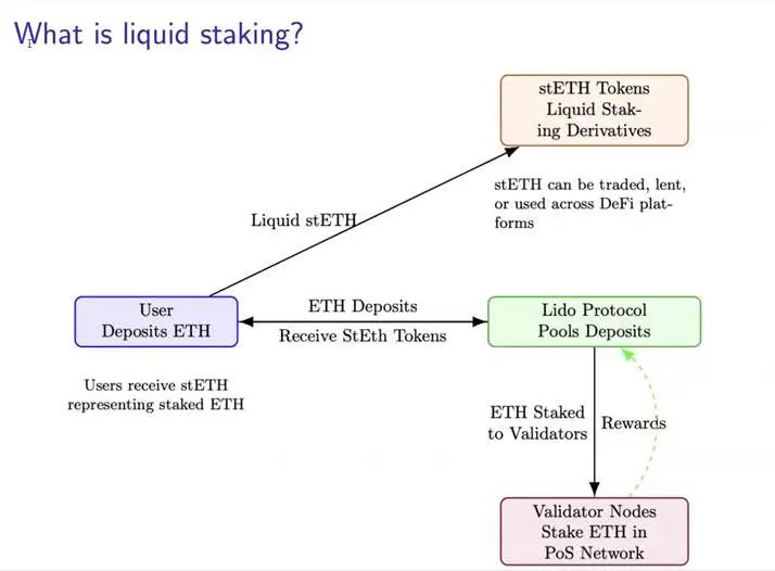 在讲座中,Parlour教授具体介绍了Lido协议及其在区块链生态系统中的作用。Lido是一种大型流动性质押协议,主要用于以太坊等区块链网络的权益证明(Proof of Stake, PoS)共识机制。与传统PoS机制相比,Lido允许用户存入小额ETH,协议则将这些资产汇总并分配至多个验证者(validators)进行质押。验证者获得区块奖励,Lido协议将收益返还至用户。用户在存款后则会收到质押代币(stETH)作为凭证,这种代币不仅代表其在协议中的资产份额,还可以在市场上进行交易或用于其他DeFi协议,从而实现了质押资产的流动性。