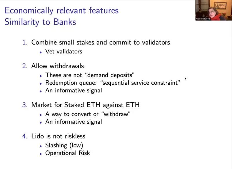 鉴于此,Parlour教授指出,Lido协议在本质上与银行体系存在相似之处:通过聚合小额ETH存款并将其存入验证者节点,类似于银行将小额存款转化为长期贷款并筛选贷款对象的过程。用户无需等待解锁周期即可通过市场交易stETH,将长期锁定的资产转化为可交易的金融工具,实现了类似银行的流动性转换功能。同时设有赎回排队机制(redemption queue),以应对大规模提款需求,类似银行挤兑中的顺序服务约束(sequential service constraint),这种机制使得用户的赎回行为具有信息性,类似银行挤兑中的信息传递。此外,协议并非无风险,验证者的不当行为可能导致质押资产被罚没(slashing),类似贷款违约的风险。