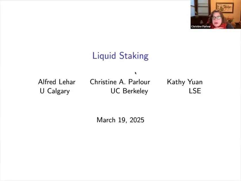 2025年3月20日上午,北京大学国家发展研究院、北京大学数字金融研究中心举办了2025年春季学期的第二场数字金融workshop。本期workshop由北京大学国家发展研究院助理教授、北大数字金融中心研究员胡佳胤主持,美国加州伯克利大学Haas商学院金融学讲席教授Christine Parlour分享题为“Liquid Staking”(joint with Alfred Lehar and Kathy Yuan)的研究,内容涵盖流动性质押、数字存款、市场挤兑风险和协议稳定性等方面。该论文通过对DeFi市场质押资产代币化的理论建模,以及使用Lido protocol数据的实证分析,刻画了当前流动性质押的特征事实,为数字存款的设计提供了新思路。四十余位老师和同学参与了本次workshop,并与主讲嘉宾进行了深入的交流和讨论。