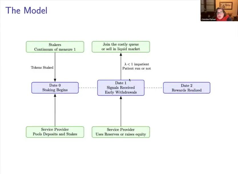 为深入理解流动性质押的经济影响,Parlour教授和团队借鉴经典银行挤兑理论,包括Diamond Dybvig(1983)模型、Goldstein and Pauzner(2005)全局博弈框架,以及Jacklin(1987)关于市场交易可替代银行存款流动性安排的研究,构建了一个基于流动性质押的银行模型。在模型中,用户被分为耐心存款人(patient stakers)和非耐心存款人(impatient stakers),其中耐心存款人根据市场信号决定是否提前赎回质押资产,而非耐心存款人则总是选择赎回。模型还引入了两种退出机制,用户可以选择在市场上出售代币或排队赎回。研究发现,市场价格与取款排队成本是影响耐心存款人决策的关键因素。如果市场价格剧烈波动,或者取款排队时间过长,可能诱发更多提款行为,甚至导致协议崩溃,陷入挤兑危机。通过分析用户的赎回行为和市场价格的互动,模型揭示了流动性质押协议在面对挤兑风险时的稳定性问题。