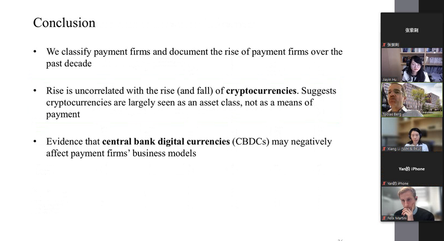 2023年10月24日,北京大学国家发展研究院、北京大学数字金融研究中心举办了2023年秋季的第六场数字金融workshop。本期workshop由北大国发院助理教授、中心研究员胡佳胤主持,邀请到德国法兰克福歌德大学金融学教授Tobias Berg分享其与合作者的最新研究《Payment Firms, Cryptocurrencies, and CBDCs(支付公司、加密货币和央行数字货币)》。二十余位老师和同学线上参与了本次workshop,并与主讲嘉宾进行了深入的交流和讨论。