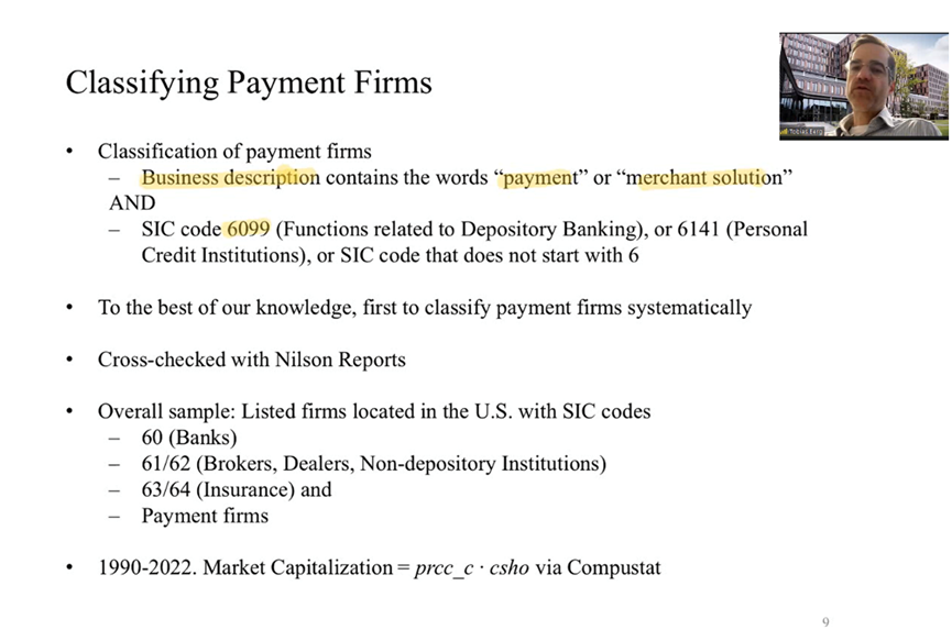 Tobias Berg教授及其合作者首先系统性地提出了对支付公司的分类方法。具体而言,他们根据公司简介中是否带有“支付”或者“商户解决方案”等词语以及SIC代码筛选出支付公司并进行了分类,数据跨度为1990年至2022年。