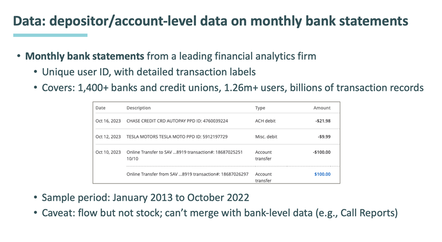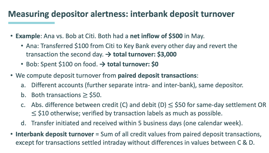 曾老师及合作者的研究数据覆盖了美国的1400多家银行和126万用户,包含了2013年1月到2022年10月间的数十亿条交易记录。这个全面的新数据集可以帮助从账户层面认识储户行为。具体而言,研究利用详细的交易级数据,构造了一个新指标——跨行存款周转率,来分析储户的银行间转账行为。跨行存款周转率量化了储户在各个存款机构的账户之间转移存款的活跃程度。