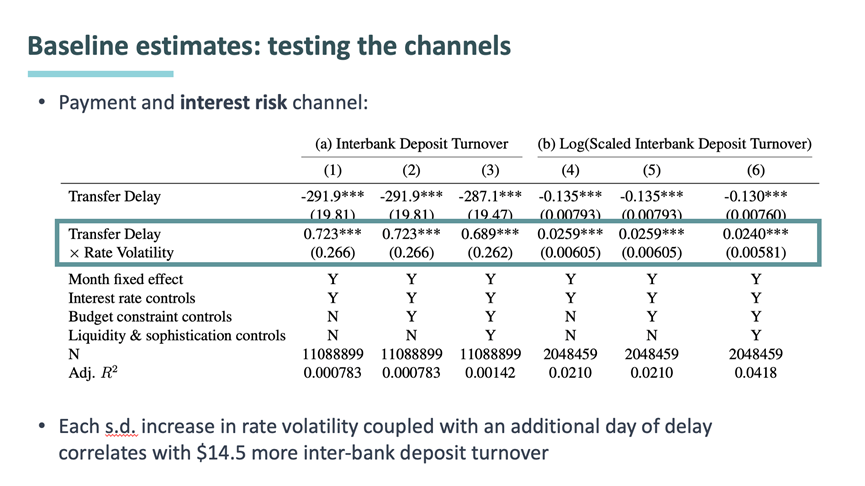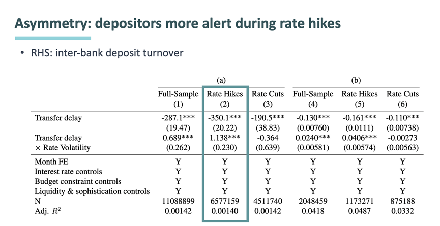 同时,研究还发现,利率风险影响存款的价值储存功能,因此储户会对利率风险作出反应:为了降低利率风险,储户倾向于更积极地在账户之间转移存款,而不是将存款放在一个地方,我们称之为利率风险渠道。对于那些面临较长跨行交易延时的储户,他们的存款周转率对利率波动更敏感。