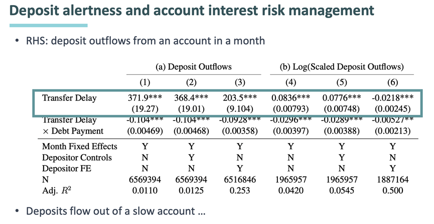 在储户层面分析的基础上,曾老师及合作者的研究还从账户层面进行了研究。是什么促使储户将资金重新分配到不同的银行账户?其中一个考虑因素可能是需要管理浮动利率债务不可预测的利息支付。因此,储户可能会选择将更多资金留在偿付浮动利率债务的账户中。研究显示:储户的存款会从转账延时更长的账户流出;不过如果这个账户需要偿还债务,那么存款的流出就会变得更谨慎。这一研究具有重要的政策意义,尤其是在支付技术快速发展和货币紧缩的背景下,强调了储户行为对银行融资成本和风险的影响。