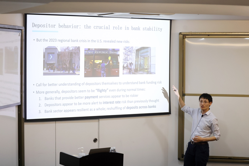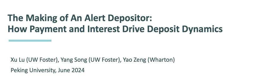 2024年6月7日,北京大学国家发展研究院、北大数字金融研究中心举办了春季学期第十四次数字金融Workshop。本次讲座有幸邀请到宾夕法尼亚大学沃顿商学院助理教授Yao Zeng(曾垚)分享题为“The Making of An Alert Depositor: How Payment and Interest Drive Deposit Dynamics(机警储户的形成:支付和利率如何影响存款的动态变化)”的研究。本次Workshop由北大国发院助理教授、中心研究员胡佳胤主持,四十余位师生在线上线下参与会议并与主讲嘉宾进行了深入的交流和讨论。