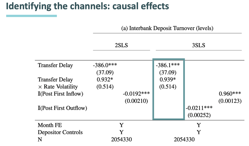 准确地对支付渠道进行因果识别是具有挑战性的:储户会根据支付需求选择银行,造成内生性。为了解决这一内生性问题,文章使用用户第一次通过新兴的快速支付软件接收资金的时点作为工具变量来因果识别。工具变量回归显示:采用新的支付技术与跨行交易延时下降相关;跨行交易延时的下降显著增加了存款周转率。