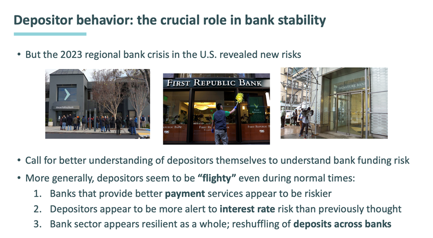 传统文献认为储户是sleepy(沉睡的,不活跃的)的:存款的利率和流量对政策利率反应不敏感;同时,银行非常依赖存款,将存款视为一种便宜且稳定的资金来源。但是2023年美国发生的以硅谷银行为代表的区域性银行危机揭示了新的风险:储户可能会变得flighty(浮躁的),尤其是在服务质量较好的专业银行和利率风险加大的时期。我们需要更好地了解储户来了解银行可能面临的资金危机。