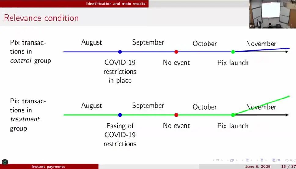 Sarkisyan教授的分析基于市级月度Pix交易数据。OLS的结果显示,在Pix推出后,本地存款市场的集中度降低,小型银行的存款增长和利率下降大于大型银行。考虑到Pix在银行数量较多的地区更受欢迎,直接使用OLS回归存在逆向因果的问题。为识别Pix推广对银行竞争的因果效应,Sarkisyan教授采用了COVID-19疫情防控措施放松作为工具变量。工具变量需要满足相关性和排他性。相关性方面,疫情防控措施的放松会提高Pix的使用。排他性方面,疫情防控对小银行存款的相对变化只通过Pix实现。鉴于传统工具变量方法依赖同方差假设,文章进一步采用Rigobon和Sack(2003, 2004)提出的异方差识别策略,获得更稳健的因果估计。