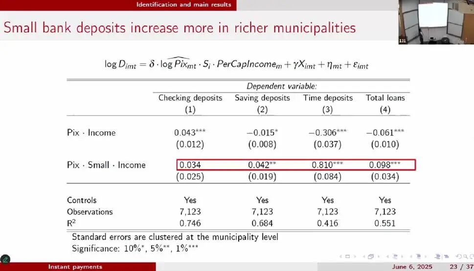 Sarkisyan教授提出,Pix通过提升支付便利性影响了银行市场的集中度。在收入较低的地区,居民更依赖大银行原有的便利服务,因此对小银行的转移意愿较弱;而在收入较高的地区,居民更有能力承担账户转换成本,更倾向于将资金转向利率更高的小银行。实证结果表明,在Pix推广后,小银行,尤其是在定期存款方面的增长,在富裕地区更为显著。