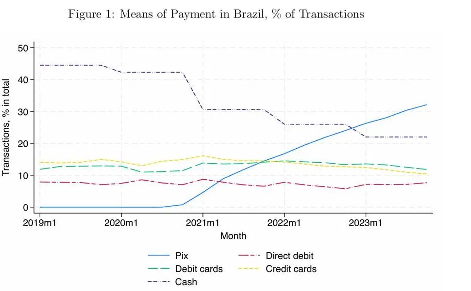 Sarkisyan教授研究了由巴西中央银行推出的即时支付系统Pix。该系统于2020年11月上线,支持即时到账和二维码支付,用户在使用Pix前需要持有银行账户。为降低准入门槛,Pix的运行成本由参与机构分摊,平均每笔交易成本约为0.001巴西雷亚尔。对用户而言,Pix免费使用;对银行而言,接入成本较低;对商户而言,支付手续费约为0.2%,远低于信用卡交易中2.2%的费率。因此,在推出后的两年内,Pix的使用比例快速增长,超过现金成为最重要的支付方式。