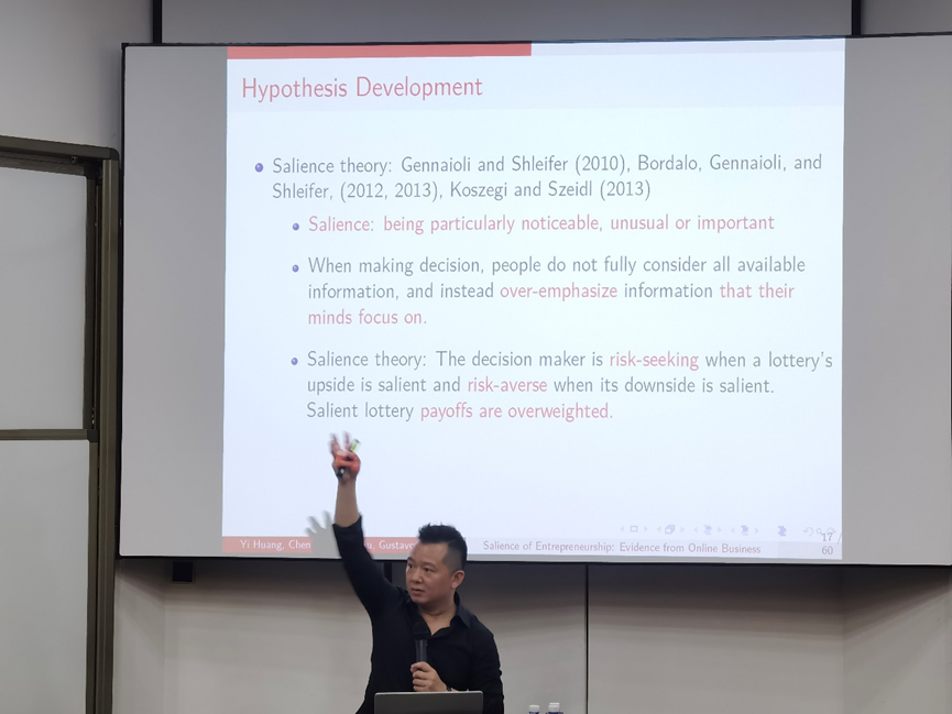 2023年4月5日,北京大学国家发展研究院、北京大学数字金融研究中心在承泽园131教室举办了2023年春季的第七场数字金融workshop。本期workshop由国发院助理教授、中心研究员胡佳胤主持,邀请到复旦大学金融学教授黄毅分享其与合作者的最新研究《Salience of Entrepreneurship: Evidence from Online Business(企业家精神的显著性:来自电子商务的证据)》。五十余位老师和同学通过线上与线下结合的方式参与了本次workshop,并与主讲嘉宾进行了深入的交流和讨论。