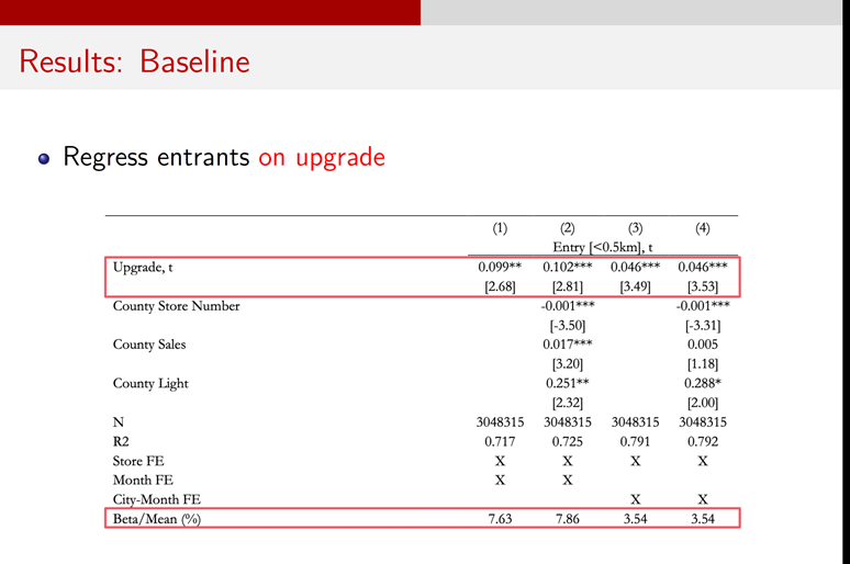 具体而言,黄毅老师和其合作者考察商户在月份发生的评级变化情况对于其周边公里内新线上商铺注册数量的影响。基准回归结果表明,评级上升对于0.5公里内的新线上商铺注册存在正向且显著的影响,这一作用在增加控制变量和调整固定效应下稳健。
