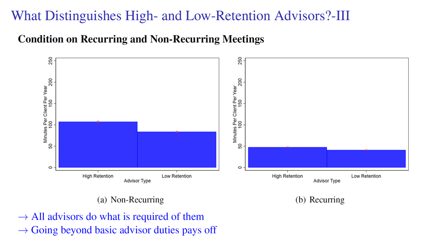 进一步的研究发现,与低水平的顾问相比,高水平顾问经常主动与客户联系,与客户见面的时长和频率也更高。与此同时,低水平顾问的客户需要自己花更多时间在网页上寻找关于智能投顾的信息。最终退出的原因中,低水平顾问的客户更可能回答“不认同投资理念”或是“希望亲自管理财富”。
