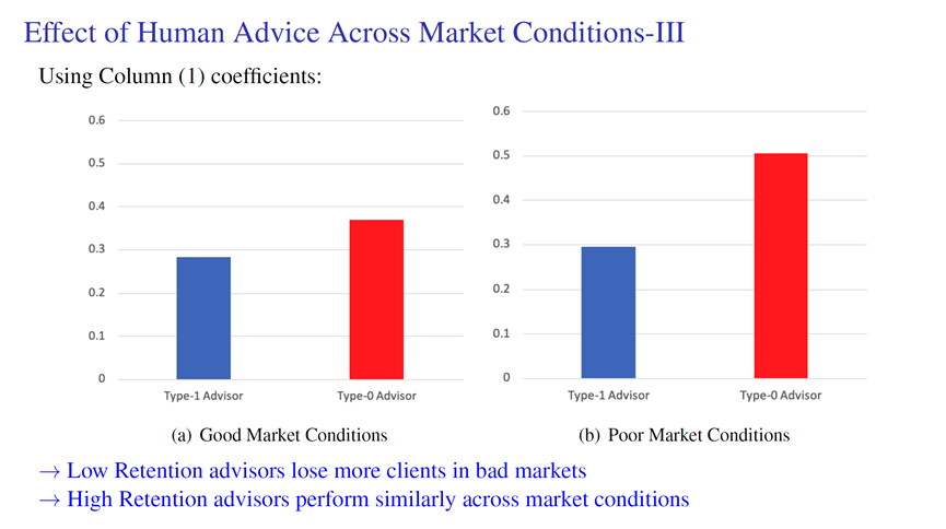 接下来,Rossi教授与合作者使用某智能投顾平台用户留存的数据对以上模型进行了定量估计。该智能投顾平台为每个客户随机匹配了一个人类顾问,提供技术支持和咨询。数据表明,高水平的人类顾问能够有效降低客户流失的概率,而且人类顾问的作用在市场行情较差时更为显著,说明高水平顾问能够说服客户财富缩水是由市场行情而非智能投顾的算法缺陷导致的。Rossi教授与合作者进一步将数据与模型相匹配,发现相比于低水平的人类顾问,高水平的人类顾问能够降低90.18%的不确定度和21.2%的固定成本。