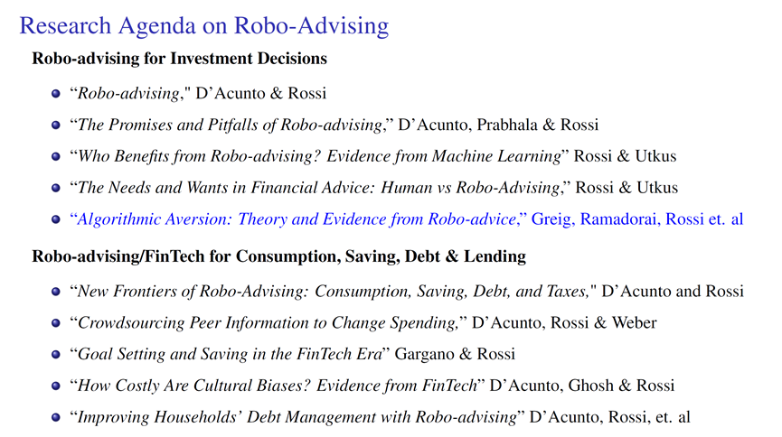 Rossi教授首先介绍了智能投顾的概念和特点,并梳理了相关的学术研究问题。智能投顾通过计算机算法,根据个人投资者的特点提供理财建议,并且能够自动执行理财计划。与传统的人类理财顾问相比,智能投顾可以避免人类顾问的偏见而且成本更低,有望提高理财顾问服务的有效性和普惠性,对家户的资产负债配置产生深远影响。与此同时,智能投顾的推广和应用仍然面临算法缺陷以及投资者不信任算法(即“算法回避”)等问题。Rossi教授与合作者正在围绕智能投顾对投资、消费、储蓄、借贷等行为的影响展开一系列研究。