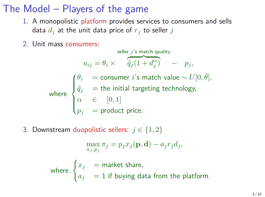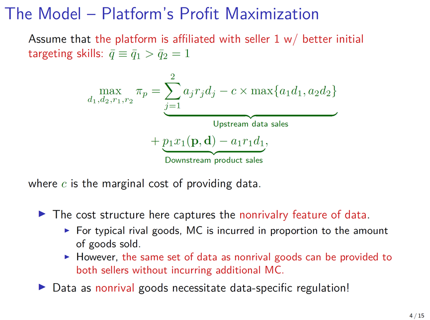 方教授与合作者构建了一个完全信息、动态的博弈模型来分析“数据中性”监管的可能后果。在这个模型当中存在一个平台,平台上有两个相互竞争的商家:一家是平台自营的,另一家则是非自营的。在博弈的开始阶段,平台生产一定量的数据,生产数据有成本。数据不具有竞争性,因此同一份数据可以同时提供给两个商家。数据可以帮助商家提高与消费者的匹配度,从而获得竞争优势。接下来,平台分别向两个商家发出出售数据的要约,包括价格和数量。给定平台提出的条件,商家决定是否接收要约并获得数据。获得数据后,两个卖家之间展开竞争。平台的目标是最大化出售数据利润与自营业务利润的总和。