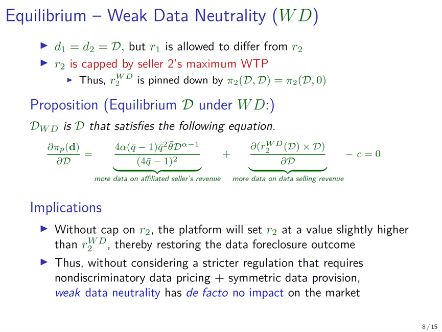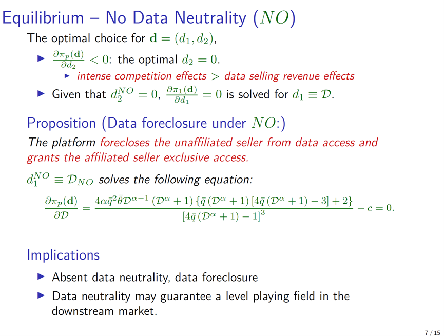 设定模型结构后,方教授与合作者讨论了三种情况:无监管、弱版本“数据中性”和强版本“数据中性”。其中,弱版本的“数据中性”要求平台向商家提供数量相同的数据,但价格可以不同,只要不超过非自营商家支付意愿的上限即可;而强版本的“数据中性”要求价格和数量都相同。在无监管情况下,可以证明,平台只向自营业务提供数据。在弱版本“数据中性”下,平台虽然名义上愿意为两类商家提供同样多的数据,但可以把面向非自营商家的价格提高到其愿意支付的上限。由于向两个商家同时出售数据会加剧下游的竞争并削减自营业务的利润,平台生产的数据量会较无监管时减少。在强版本的“数据中性”下,自营和非自营商家有可能同时以相同的价格获得等量的数据。不过,由于强版本“数据中性”之下数据的出售价格较弱版本时更低,平台生产的数据量会进一步减少。