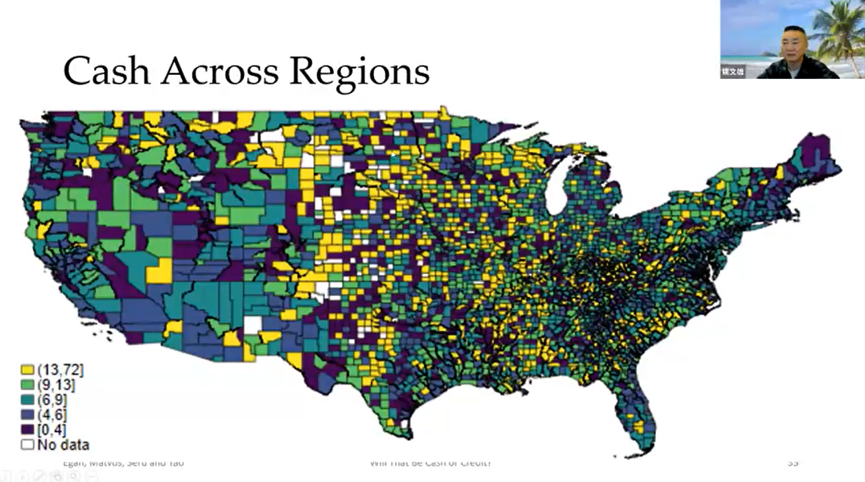 姚教授及合作者基于数据对支付方式的选择进行了分析。首先,作者用线性回归模型,以现金交易比例和借记卡占比作为因变量做了回归。回归结果显示,由于线上购物主要以信用卡等支付手段为主,所以电商购物与现金支付方式是负相关的。其次,当该商户月销售额越大时,平均每单销售额越低时,现金支付的占比会越高,比如传统超市中的交易。然而现金储存难度较大,因此这个回归结果也映照了对央行发行数字货币的建议。