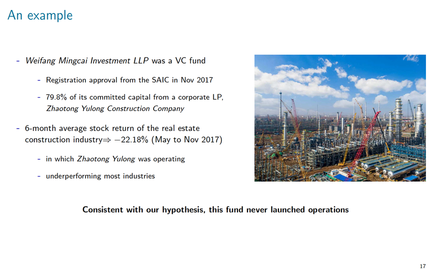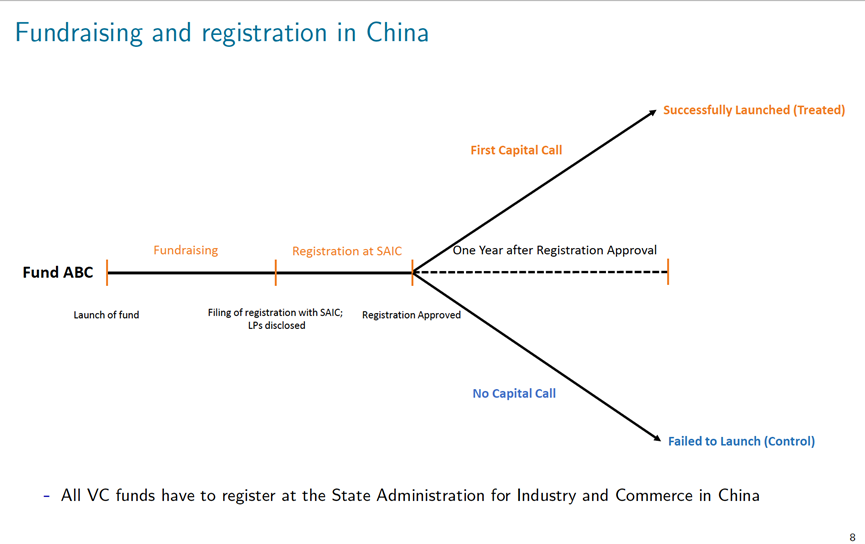 刘通老师详细介绍了他们研究使用的数据和中国的制度背景(下图)。刘通老师讨论了在中国设立风险资本基金的典型流程和相关的制度背景。这个流程通常开始于基金经理(GP)与潜在的有限合伙人(LPs),包括个人和公司,进行沟通并设定筹资目标。一旦筹资目标达成,基金经理将开始进行相关的文书工作,包括在中国工商行政管理总局(SAIC)注册基金。教授指出,自2014年以来,中国引入了新规定,即在SAIC注册基金的同时,基金还需要在中国的资产管理协会进行备案。这些步骤完成后,基金便拥有了在市场上启动的法律权利。然而,实际的结果可能有两种:成功启动的基金和僵尸基金。成功启动的基金是那些在获得批准后能够调用资金并开始投资的基金。而僵尸基金则是那些尽管获得了注册批准但最终未进行任何资本投资的基金。