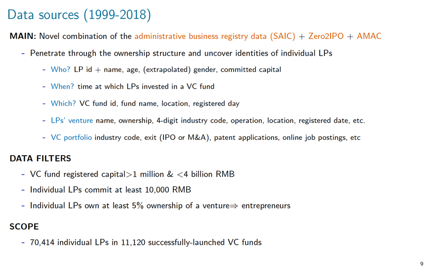 在数据和制度背景部分,刘通老师讲述了为研究提供的必要背景信息,包括基金筹集和注册的流程、数据来源、以及他们如何处理和分析这些数据,以便更好地理解个人LPs在风险资本市场中的行为和影响。