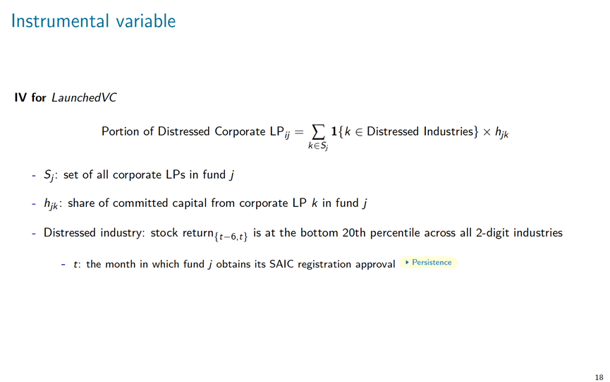 刘通老师还通过具体的案例来阐释他们的实证设计和识别策略。他展示了一个具体的案例,通过分析一个特定的风险资本基金和其最大的企业LP,来说明他们是如何追溯和分析数据的。他们关注了企业LP所在行业的财务困境,并将这与基金的启动成功或失败联系起来。在这个案例中,他们追溯了一个大型企业LP在基金获得注册批准前六个月的行业股票回报率,以此来评估该企业LP的财务困境程度。此外,他还讨论了对企业LP所在行业冲击的分析,这些外生冲击可能影响了企业LP对基金的承诺,进而影响了基金的启动。主要的识别假设是,企业 LP 在基金注册获批前六个月所经历的行业状况仅通过风险投资基金是否成功发起来影响单个 LP 的创业活动。他们将这些行业冲击与基金成功启动的概率相联系,展示了如何使用工具变量来解决潜在的内生性问题。