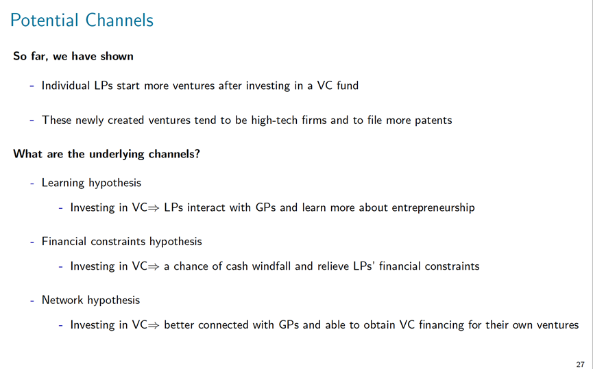 在潜在机制(Potential Channels)部分的讨论中,刘通老师探讨了个体投资者(LPs)成为风险资本基金的有限合伙人后,其创业活动增加的潜在机制。刘教授提出并检验了三种可能的渠道,解释为何LPs的创业活动会因为投资风险资本基金而增加:学习渠道,这是最主要的假设,LPs通过与管理风险资本基金的GP(一般合伙人)的互动学习到关于创业和行业的知识。这种学习可能包括了解新技术、行业趋势、管理策略等。财务约束渠道,这个渠道假设LPs通过投资成功的基金,减轻了自己的财务约束,从而有更多资源去创业。网络假设,这个假设认为,通过风险资本基金的投资,LPs能够建立起一个强大的行业网络,这个网络可能有助于他们未来的创业活动,包括找到合作伙伴、获取融资等。
