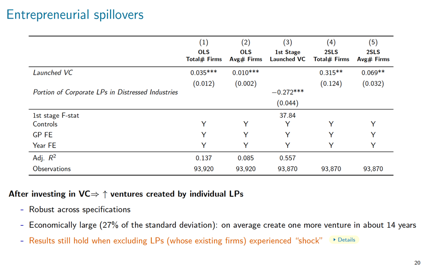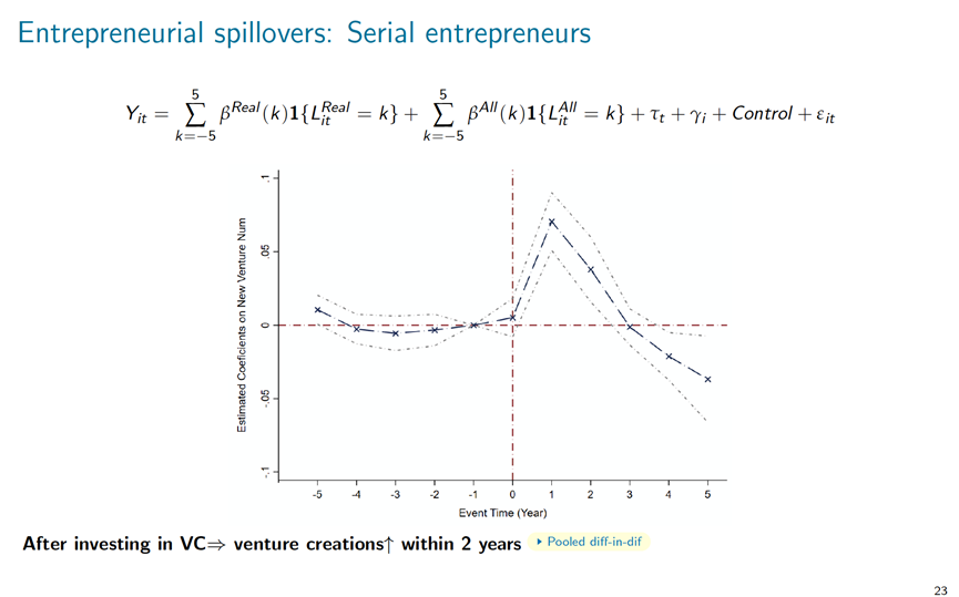 具体来说,在创业溢出效应小节中,刘通老师集中讨论了他们的研究发现,即个人有限合伙人(LPs)在投资风险资本基金后所表现出的显著的创业溢出效应。工具变量法的研究发现个人LPs在投资风险资本基金后,创办新企业的数量显著增加。研究表明,这种创业溢出效应在投资成功的风险资本基金中尤为显著。个人LPs通过与成功的基金的互动和学习,可能获取了宝贵的知识和资源,从而提高了他们创办新企业的可能性。研究发现,相比于未成功启动基金中的个体投资者,成功投资基金的LPs创建了更多的企业,平均每年增加0.07家公司,这一效应在初次投资后的前两年最强烈。