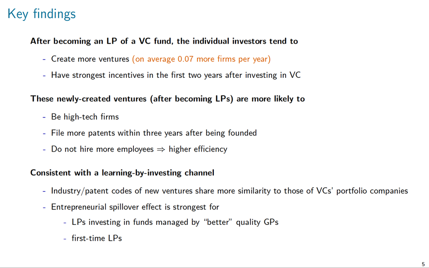 具体来说,刘通老师和合作者构建了一个涵盖全面的企业创立活动和国内风险资本活动的独特数据集,并利用这些数据集的优势来揭示所有类型的LPs(包括个人LPs)的名字、身份和相应的财务承诺。此外,他们还特别提到了使用中国的独特制度特征来构建工具变量,解决基金启动成功与否可能不是随机的问题。最后,教授概括了研究的关键发现,即投资于风险资本基金的个人LPs倾向于创立更多的企业,尤其是在他们投资后的前两年内。这一发现表明,风险资本投资对促进个人创业活动和技术创新具有显著的正面影响。同时,所有的证据都指向了一个核心机制——“通过投资学习”的渠道,表明个人LPs从他们投资的基金的投资组合公司中学到了如何创业。