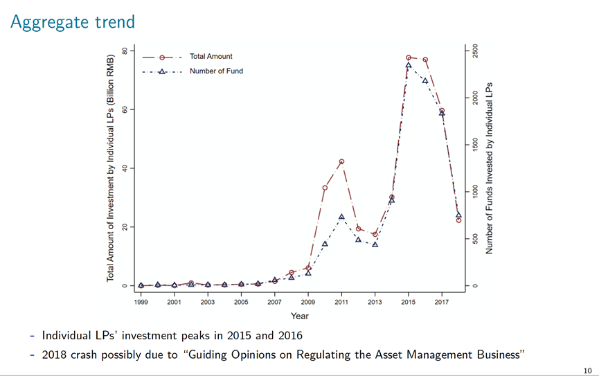 刘通老师展示了中国风险资本投资活动的总体趋势和包含个人LPs的基金数量随时间的变化。自2009年以来,个人LPs的投资活动有了显著的增长,并在2015年和2016年达到顶峰。同样,从个人LPs那里来的总资金量也在这段时间达到高峰,大约在2015年和2016年达到了约800亿人民币。