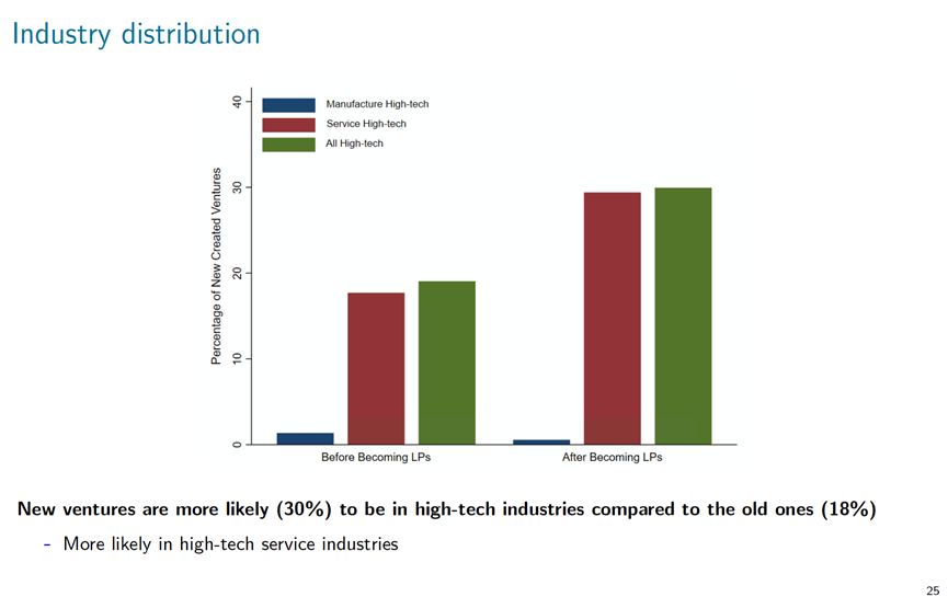 行业代码相似性:研究比较了LPs创立的新企业与他们所投资的VC基金的投资组合公司在行业代码上的相似性。如果LPs确实从GP那里学习到了有关特定行业的知识,那么我们应该期待新创企业的行业分布与VC投资的行业分布有较高的一致性。研究发现,新企业的行业代码确实与LPs投资的VC基金的投资组合公司的行业代码相似度更高,支持了学习假设。