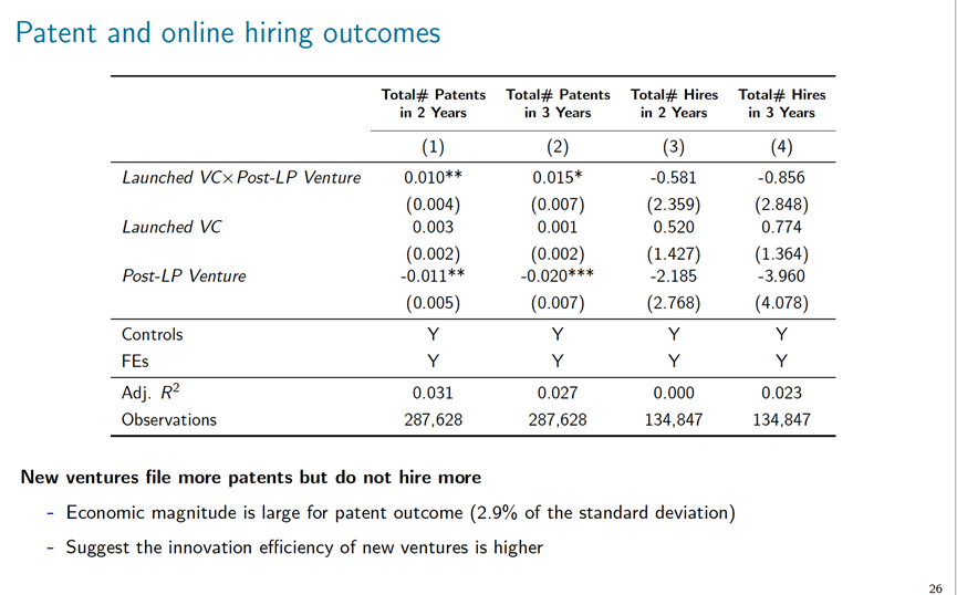 此外,新创立的企业倾向于高科技领域,拥有更多的专利申请,这一发现支持了通过投资学习的假设,即LPs通过他们的风险资本投资学到了有用的知识和技能,并将其应用于自己的创业项目中。研究还发现,尽管新创立的公司在成立后的2到3年内并没有显著增加员工数量,但他们却有更多的专利申请。这一点可能表明,尽管这些新公司在规模上没有快速扩张,但他们在研发和创新方面更为高效和专注。