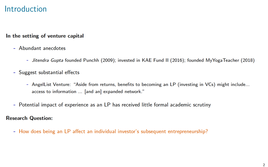 刘通老师首先介绍了他们的研究动机,即创业金融文献中对投资者和企业家的传统观点将两者视为不同的身份或群体,主要是因为他们在合同签订、为公司增值、或管理公司方面的差异。然而,随着金融中介如天使投资者或众筹平台的日益重要,企业家和投资者之间的界限变得越来越模糊。刘通老师通过各种事例,如一位基于加利福尼亚的企业家的故事,强调了这种互动经验的实质影响,展示了成为有限合伙人(LP)除了财务回报外,还可能包括获取信息和扩展网络的其他好处。