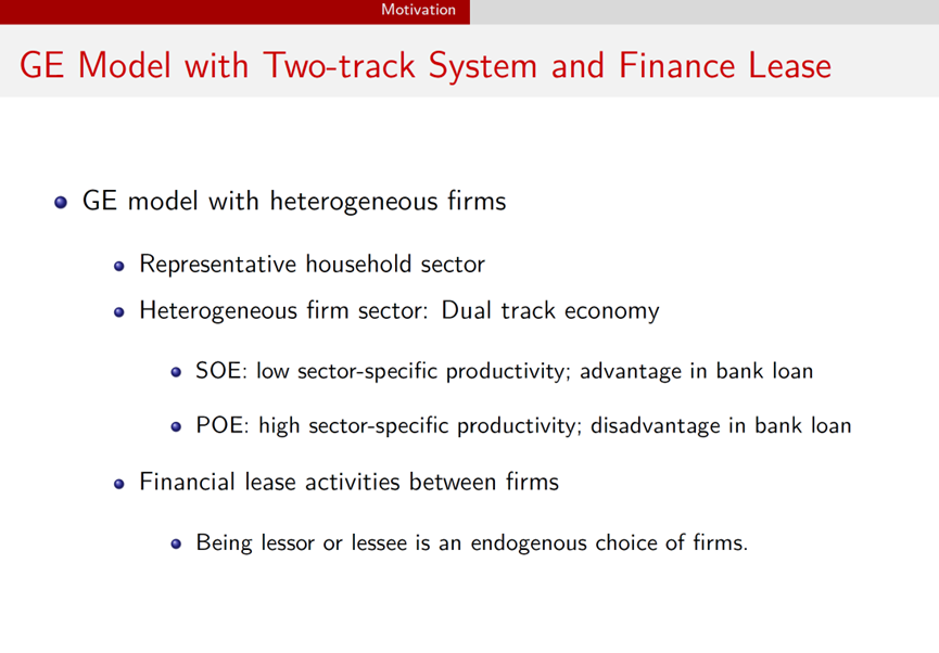 为了系统分析融资租赁的宏观经济效应,研究构建了一个包含异质性企业的一般均衡模型。模型中的企业按所有制分为国有和民营两类,它们在部门生产率和融资约束上存在不同。在银行贷款当中,给定相同的抵押品数量,国有企业比民营企业能够获得更多的银行贷款,即国企的抵押率高于民企。但在融资租赁当中,国企和民企模型的抵押率相同,而且由于融资租赁具有较强的资产收回优势,其有效抵押率高于传统银行贷款。企业可以根据自身特征选择是否成为出租方或承租方。模型分析表明,这一特征使得融资租赁能够通过两个渠道提升资本配置效率:它让生产率较低的国企可以将闲置资本出租获取租金收入,同时使得生产率较高但融资受限的民企能够获得更多资金扩大生产规模。