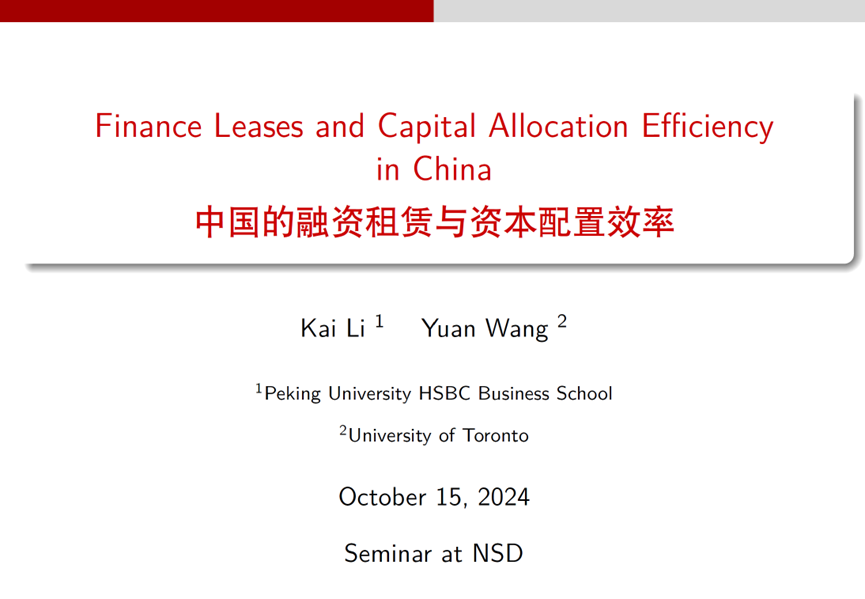 2024年10月15日,北京大学数字金融研究中心举办本学期第三次数字金融Workshop。本次Workshop有幸请到北京大学汇丰商学院金融学教授Kai Li(李凯)报告题为Finance Leases and Capital Allocation Efficiency in China(中国的融资租赁与资本配置效率)的研究。本次Workshop由北大国发院助理教授、中心研究员胡佳胤主持,七十余位师生分别通过线上、线下渠道参与Workshop。